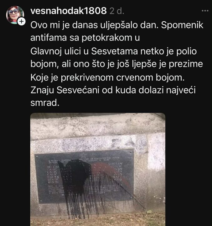 Dan ranije u Sesvetskim selima Spomen ploča borcima NOB-a premazana je crvenom bojom, pri čemu su posebno crvenom bojom precrtana neka prezimena , uz dodatak da su to domaći smradovi.
